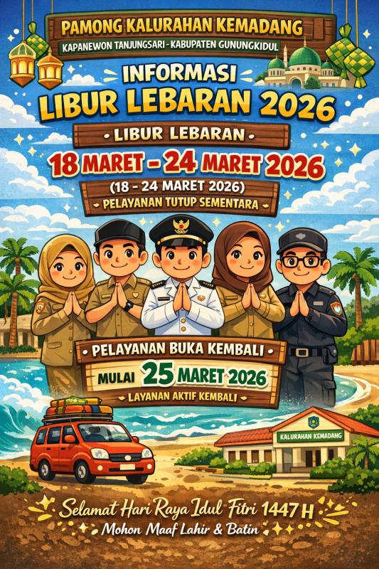 Kemadang ( SIDA ) : Dalam rangka memperingati dan menyambut Hari Raya Idulfitri 1447 Hijriah / Lebaran Tahun 2026, Pemerintah Kalurahan Kemadang, Kapanewon Tanjungsari, Kabupaten Gunungkidul menyampaikan informasi kepada seluruh masyarakat terkait jadwal libur pelayanan kantor kalurahan.
